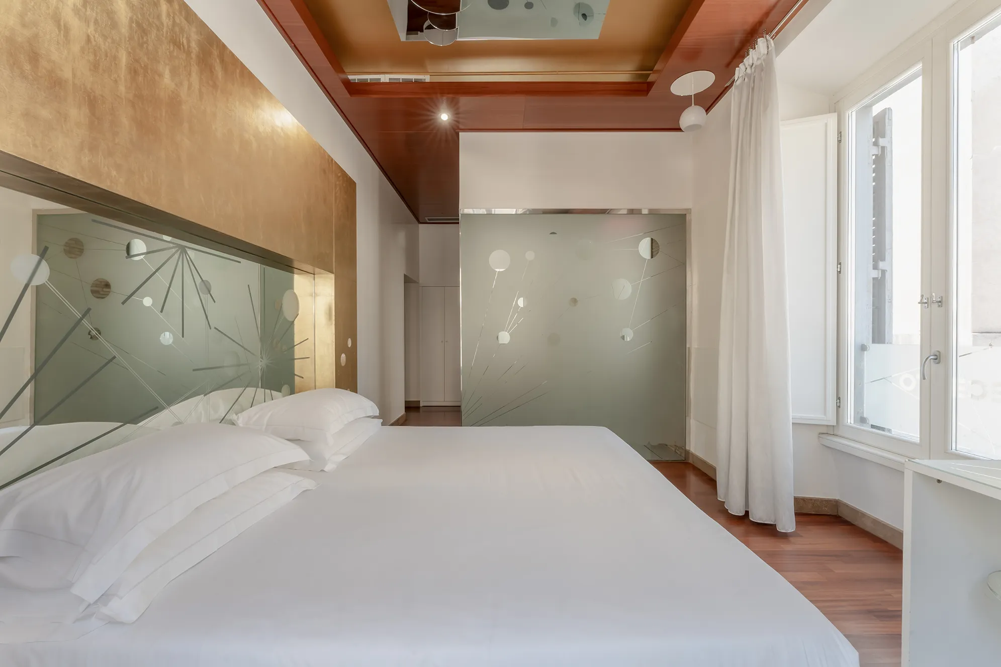 Il letto king-size, valorizzato da eleganti luci da lettura, invita a momenti di relax intimo, mentre la domotica integrata permette agli ospiti di regolare illuminazione e atmosfera secondo le proprie preferenze, creando ogni volta l’ambiente ideale.
